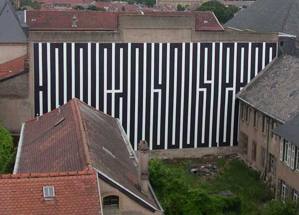 Das ist wahrhaftig eine gigantische Typo, die Tania Mouraud dort auf eine Wand mit dem Endformat von 30,0 x 14,5 m gestaltet hat: