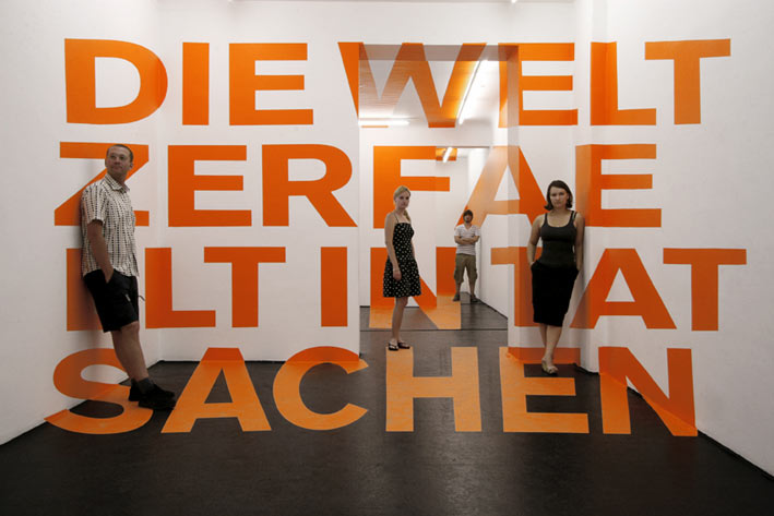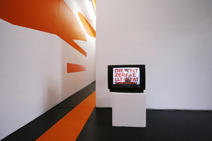 Die Arbeit befasst sich mit dem Erleben der Gleichzeitigkeit von Raum und seiner Abbildung. Die typografischen Fragmente setzen sich aus dem Blickwinkel einer Videokamera zu dem Schriftzug „Die Welt zerfällt in Tatsachen“ zusammen, der als Livebild auf drei verschiedenen Monitoren zu sehen ist. Mit Hilfe dieser Installationsanordnung hat der Betrachter die Möglichkeit, den Bildraum selbst zu erforschen und die Wechselwirkung von Raum und Abbild zu erfahren. Ludwig Wittgensteins Satz „Die Welt zerfällt in Tatsachen“ und sein Zerfallen im Raum sollen, an Wittgensteins Sprachtheorien angelehnt, die Unzulänglichkeit der Sprache visualisieren.